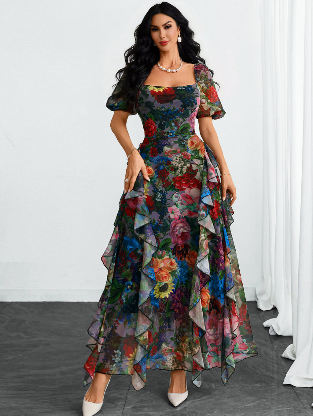 GothDark Women Floral Dress Square Neck Puff Sheer Puff Sleeve Flowy Ruffle Hem Formal Wedding Guest Party Mesh Dresses