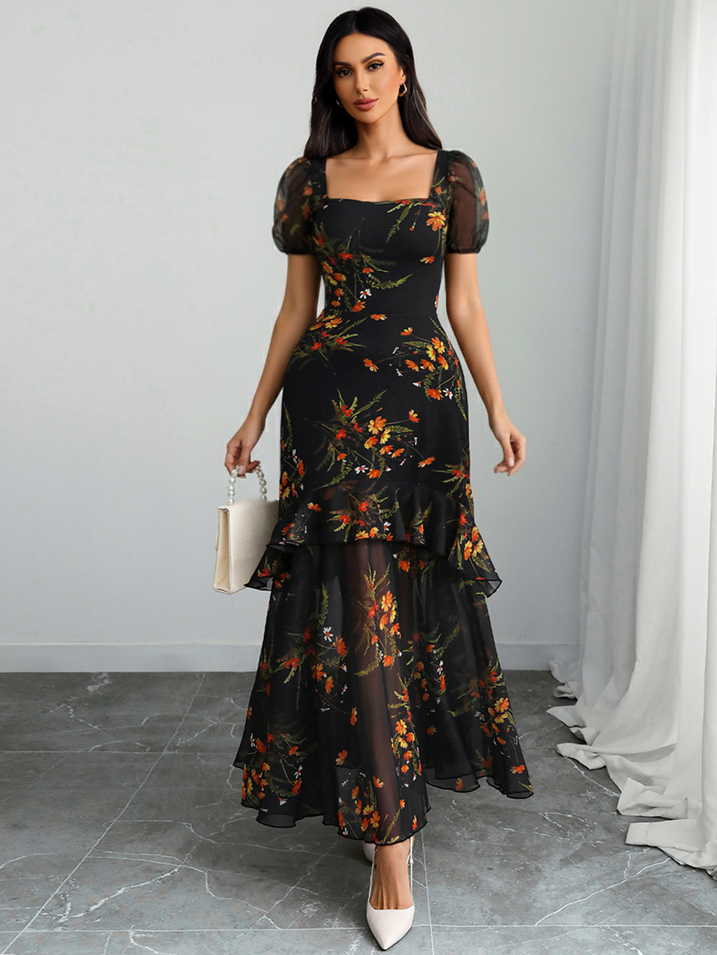GothDark Women's Floral Mesh Dress Elegant Long Sleeve Square Neck Double Layer Ruffle Hem Casual Wedding Guest Maxi Dresses