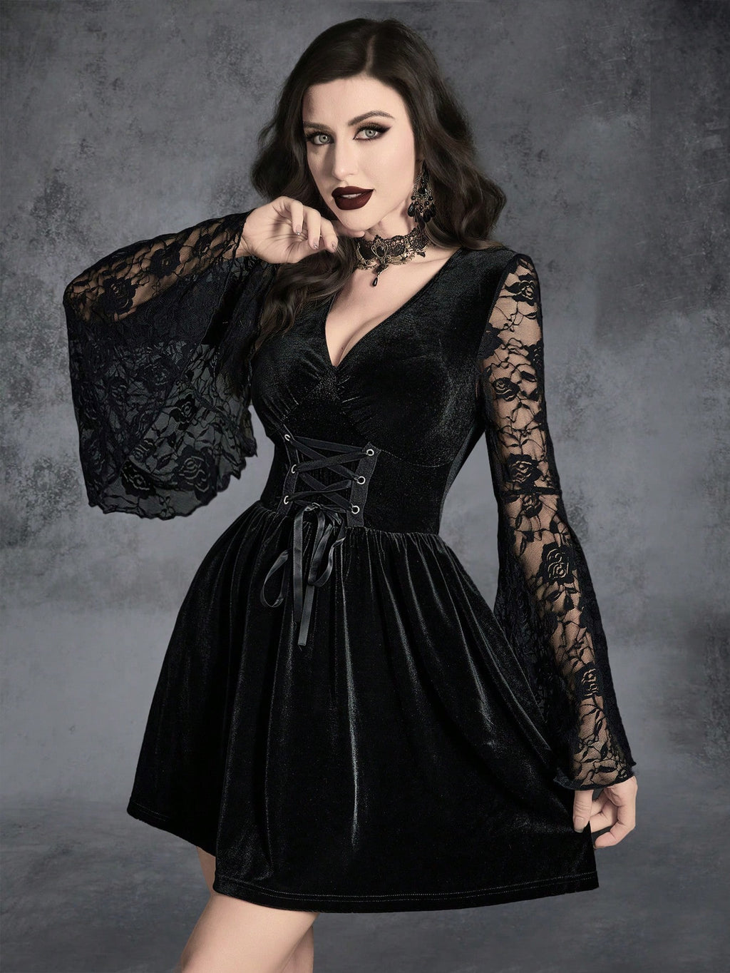 GothDark Contrast Lace Frill Trim Velvet Dress