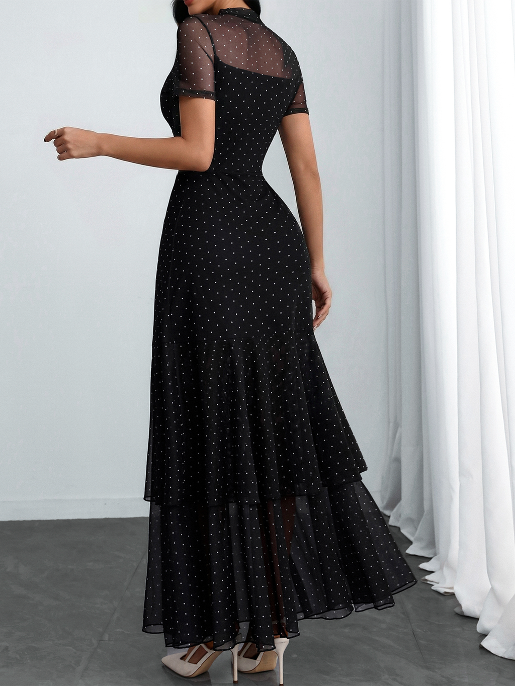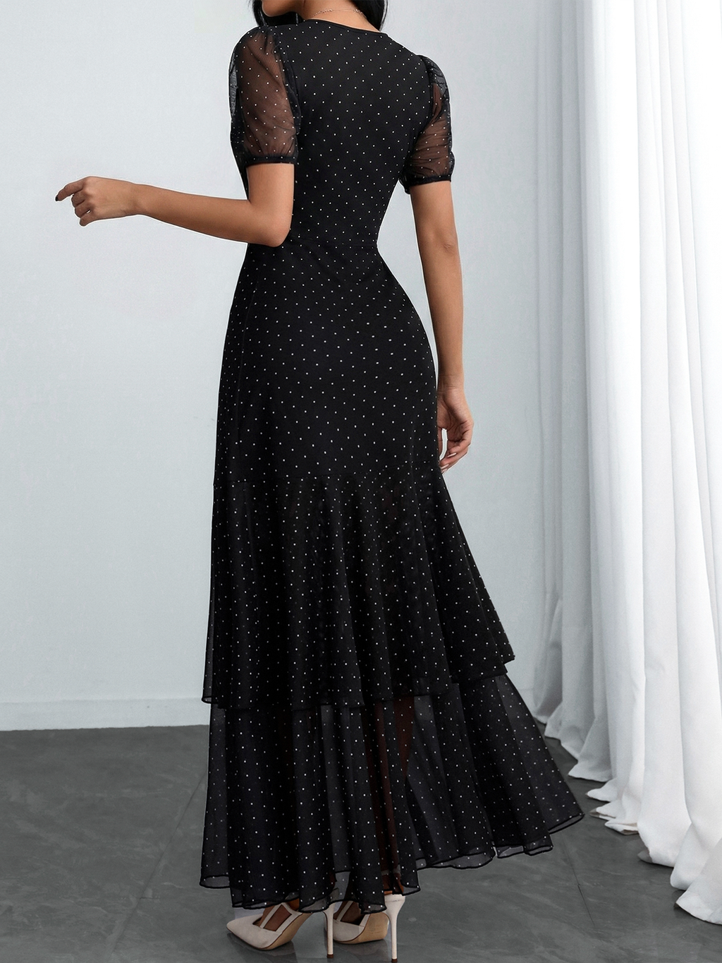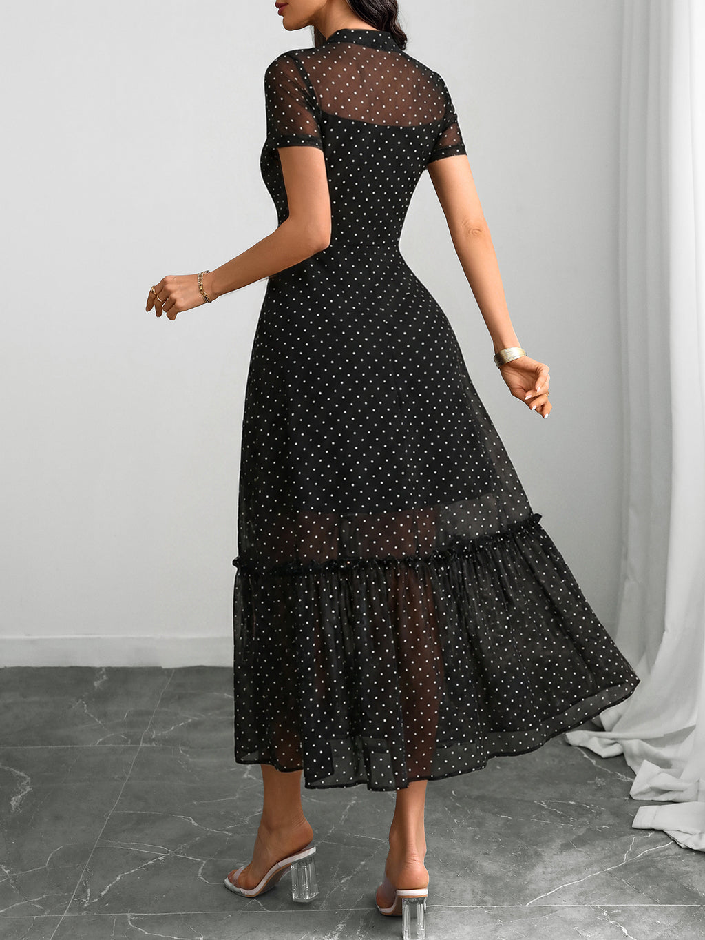 GothDark Women's Summer Polka Dot Mesh Ruffle Dress Short Sleeve Round Neck Waist Casual Maxi Wedding Guest Dresses