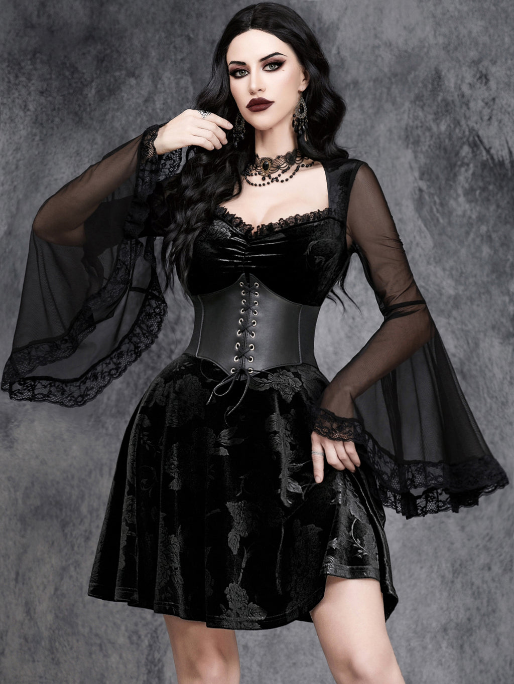 GothDark Womens Black Lace Velvet Gothic Dress Bell Sleeve Sexy Cosplay Halloween Vintage Romatic Dresses