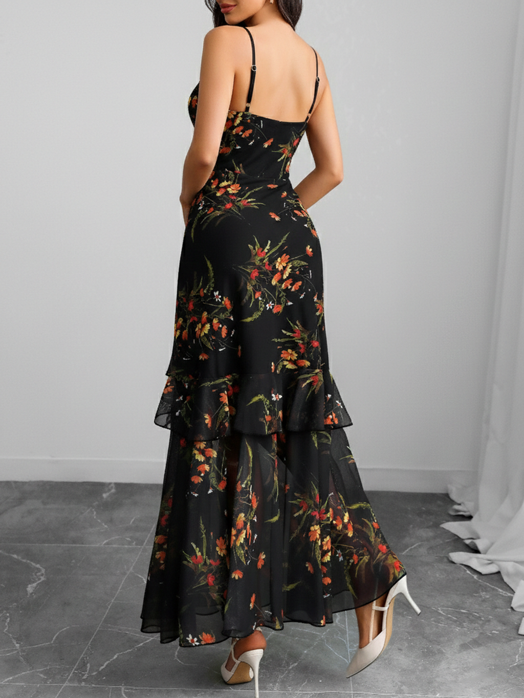 GothDark Women Floral Mesh Maxi Dress Sexy V Neck Spaghetti Strap Tiered Ruffle Hem Party Long Dresses for Wedding Guest