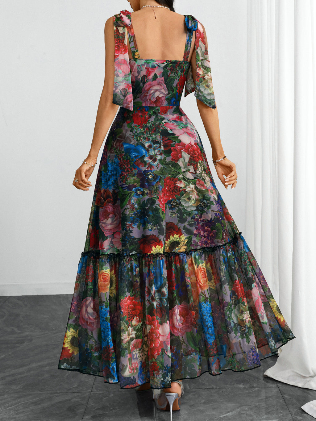 GothDark Women's Floral Mesh Maxi Dress High Waist Tie-Strap Sweetheart Neck Tiered Hem Casual Wedding Guest Dresses