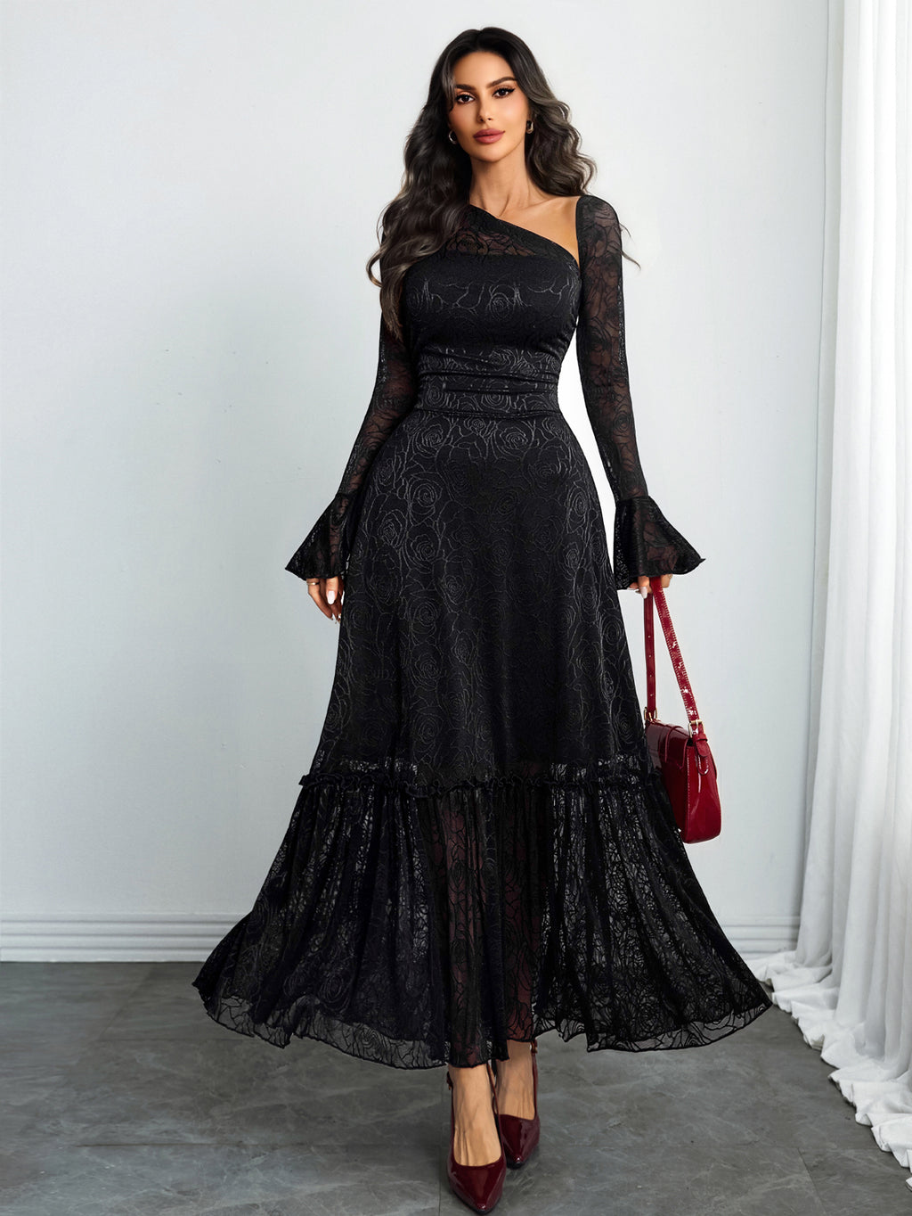 GothDark Women's Maxi Floral Dress A Line One Shoulder Lace Sheer Long Sleeve Ruffle Hem Formal Party Date Night Dress