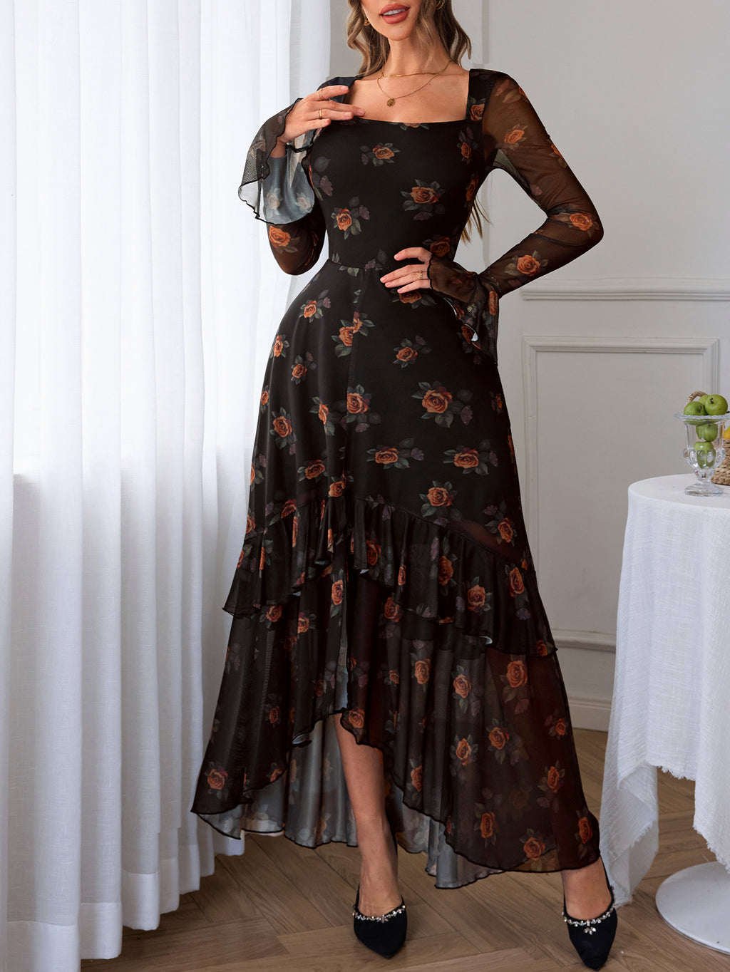 GothDark Women's Floral Dress Mesh Sheer Long Sleeve Square Neck Ruffle Layered Elegant Date Night Holiday Party Outfit
