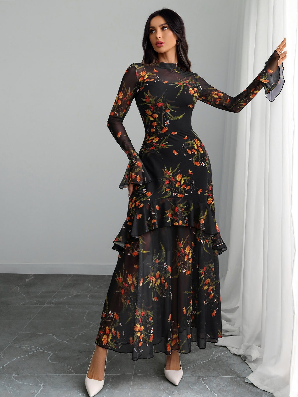 GothDark Women's Floral Mesh Dress Elegant Long Sleeve Square Neck Double Layer Ruffle Hem Casual Wedding Guest Maxi Dresses