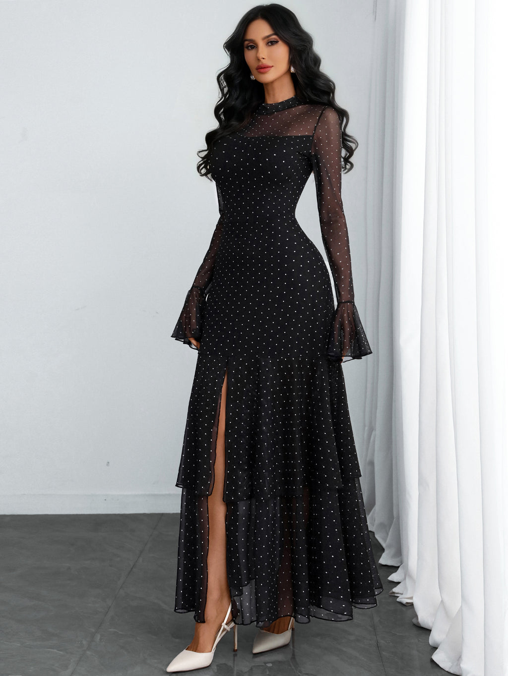 GothDark Womens Elegant Polka Dot Mesh Long Sleeve Dress Bell Sleeve Layered Ruffle Split Formal Wedding Guest Dresses